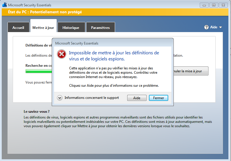 J'ai désinstallé Microsoft Security Essentials puis réinstallé c'est toujours pareil, et je n'arrive plus à installer.