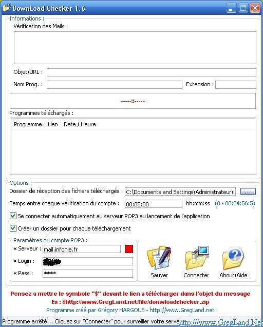 Je suis au boulot et je trouve le fameux programme de 50Mo à télécharger. J'envois un mail a mon adresse hgreg AT infonie.fr (l'adresse qui est surveillée de chez vous) avec comme objet le lien du logiciel a télécharger et je mets avant le lien le signe ''$'' (Dollard) DownLoad Checker en surveillant ma boite de mail va voir que vous lui envoyez un programme a télécharger et va le télécharger immédiatement.