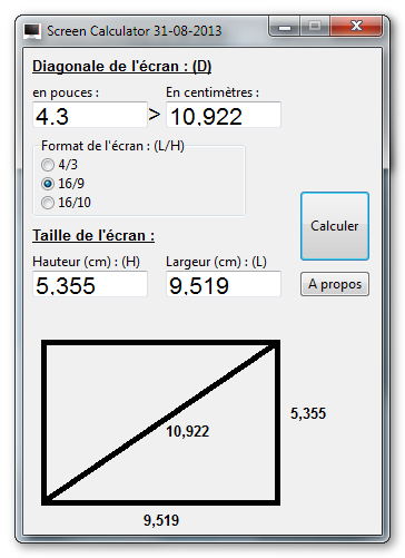 ScreenCalculator est un petit utilitaire qui vous permet de déterminer les dimensions d'un écran (Largeur et Hauteur) à partir de sa diagonale (ex:22") et de son format (ex:16/9).